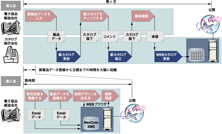 図6:NeoCore XMSを使用したWebカタログ管理システムの流れ (画像をクリックすると別ウィンドウに拡大図を表示します)