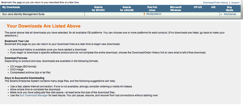 次に、画面に表示されている「Download Center(sun.com)」と書かれたボタンをクリックしてください。するとダウンロードセンターにジャンプします。このページには今回の対象となるミドルウェア系だけではなく、Solarisや開発ツールなどのソフトウェア製品も含めて、ソフトウェアのダウンロードサイトとして集約されています