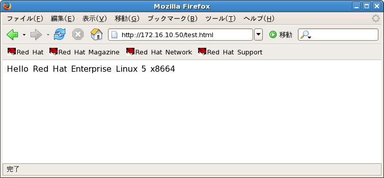 次にサーバ上にあるWebブラウザでも確認しておきましょう。Red Hat Enterprise Linux 5には、FireFoxが標準添付されていますので、これを使ってtest.htmlファイルにアクセスして表示されるかを確認します。図2のように、Webブラウザにtest.htmlファイルの内容が表示されていれば、Webサーバは正しく稼動しています。