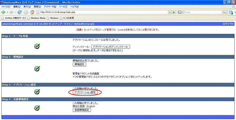 次に「http://www.xxx.co.jp/phpgroupware/setup/」へWebブラウザでアクセスし、動作するかを確認してください。このときURLはphpGroupWareをインストールしたマシンのアドレスとなります。