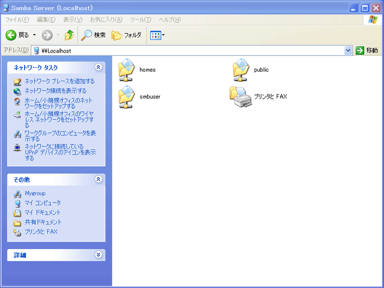 設定を確認できたら、「ファイル名を指定して実行」、もしくはエクスプローラのアドレス欄などに「\\Sambaサーバ名」と入力し、共有ディレクトリにアクセスします。IDとパスワードの入力を要求されますので作成したsmb用のユーザとパスワードを使用してログインしてください。Shareフォルダへアクセスできるようであれば、ファイルサーバの構築は完了です。