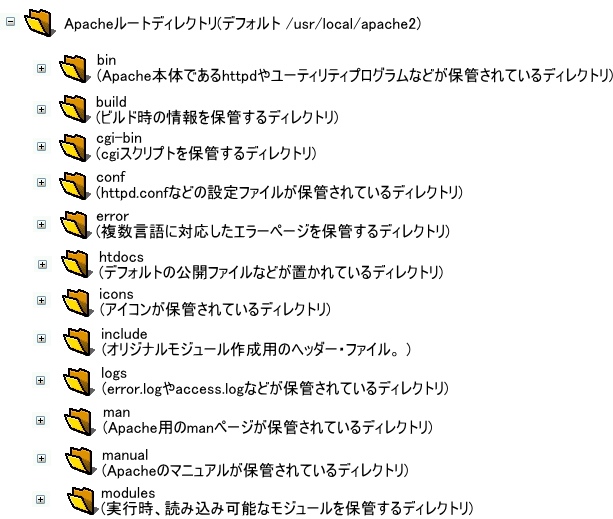 今回インストールしたapacheのディレクトリ構成は次の通りです。