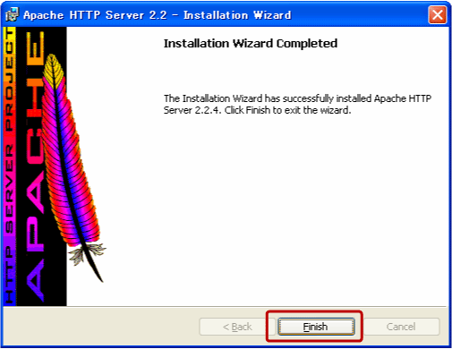 以上でApacheのインストールは完了です。「Finish」ボタンを押して、インストーラを終了します。