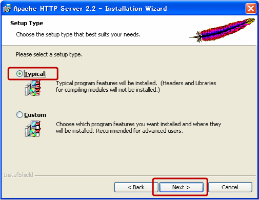 次にセットアップのタイプを選択する画面となります。今回は「Typical」ボタンを選択しましょう。なお、Customでは各種ライブラリやドキュメントなどをインストールするかなどを設定できます。