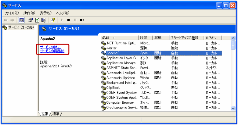 サービスからApacheの「開始・終了」を指示する。 |