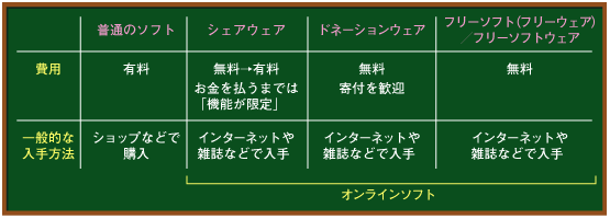 図1:フリーソフトとシェアウェア、ドネーションウェアの違い (画像をクリックすると別ウィンドウに拡大図を表示します)