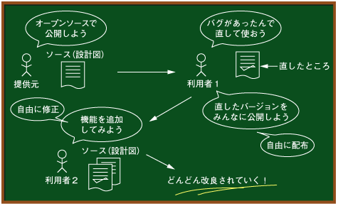 ソースを公開することで、いろんな人がソースを直していってプログラムが改良されていくというのがオープンソースの基本的な考え方。