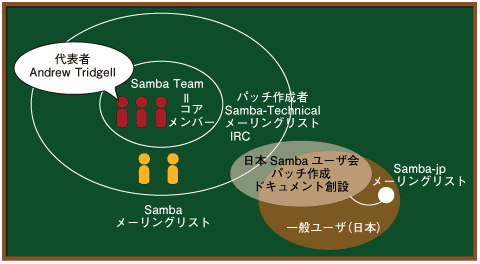 この他にもコミッタではないけど、パッチを作ったり積極的に開発に関わっている方もいて、主に「samba-technical」というメーリングリストを中心に活動しているね。それ以外にも多くの人が、samba-technicalや「