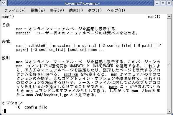 コマンドに限らず、各種マニュアルを閲覧することができます。例えば「man コマンド名」で実行することにより、コマンドや使用可能なオプションの詳細が表示されます。もとの画面に戻るときは「q」を押してください。
