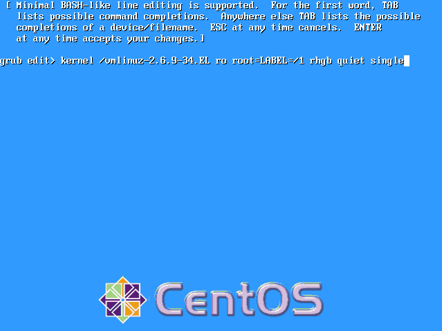 そうしたら「grub edit> kernel /vmlinuz……quiet」の後ろに、スペースに続けて「single」と追加して「Enter」を押します。「single」の代わりに「1」と入力しても同様です。1つ前の画面に戻ったら「B」を押します。以上がシングルユーザモードで起動する手順となります。