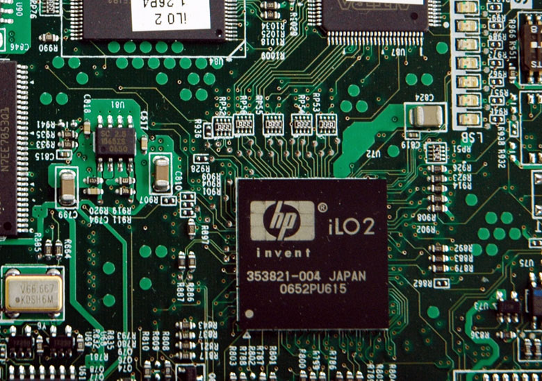 ロジックボード上にiLO2のコントロールプロセッサが実装されている (画像をクリックすると別ウィンドウに拡大図を表示します)