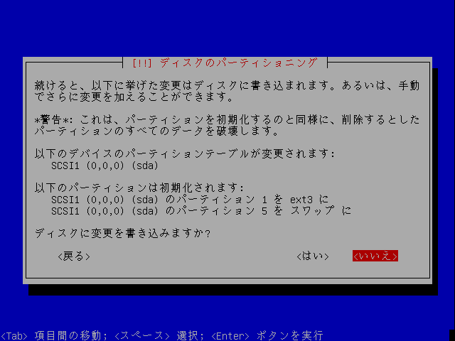 ここまでで、ハードディスクの設定項目に関する質問にすべて答えたことになります。最後に、本当にフォーマットしてパーティションを作成してよいかどうかの確認画面になります。ここで「はい」を選択すると、実際のフォーマット作業に進みます。ここでは安全のため、「いいえ」が選択された状態になっています。Tabキーを押して、「はい」を選択してEnterキーを押してください。
