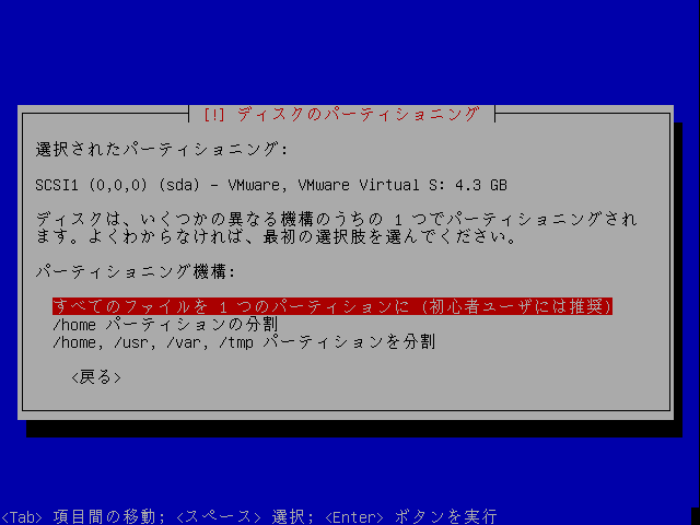 すると、今度はパーティション構成の選択画面になります。デフォルトでは「すべてのファイルを1つのパーティションに」という項目が選択されています。通常はその設定で問題ないので、ここでもそのままEnterキーを押して次に進みます。