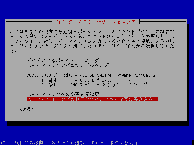 するとパーティション構成が表示され、その設定で問題ないかどうかの確認画面になります。「パーティショニングの終了とディスクへの変更の書き込み」を選択し、先に進みます。