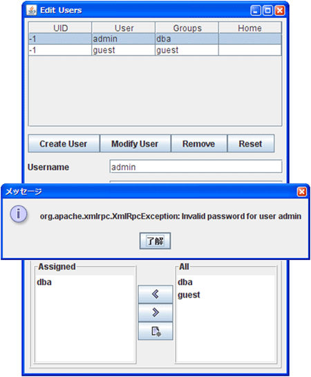 パスワードを変更を行うために「Modify User」をクリックすると、筆者環境では以下のような「org.apache.xmlrpc.XmlRpcException: Invalid password for user "ユーザー名"」というメッセージが表示されました。
