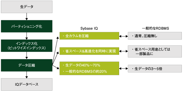 通常、データの圧縮はリソース消費を抑えるために行われますが、Sybase IQの場合は処理の高速化のための実装でもあります。