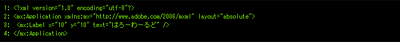 2行目からは表示されるウィンドウの定義です。2行目では一番親になるコンポーネントを定義します。今回はアプリケーションウィンドウなので「mx:WindowedApplication」というコンポーネントをベースにします。そして、このウィンドウの中に、文字を表示させるmx:Labelコンポーネントを置き、座標とテキストを指定します。