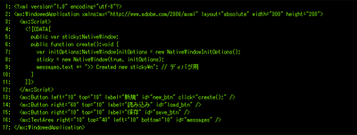 次に実際に付箋を作るcreate関数を定義します。MXMLの中でスクリプトを使うには<mx:Script>タグを使って、次のようにします。