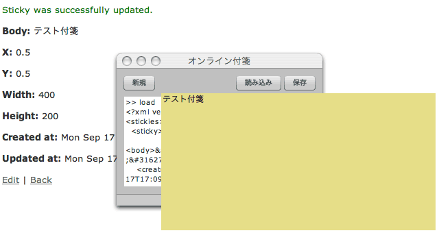 新規の付箋を保存する場合には、上書き保存と違うURLへアクセスする必要があります。新規保存の場合には「http://localhost:3000/stickies.xml」へPOSTメソッドでデータを送る必要があります。