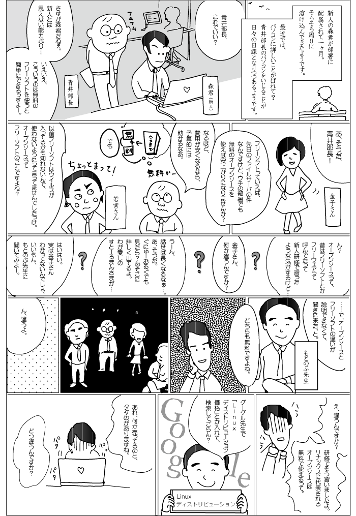 TOPサーバ構築・運用> マンガ版 たかはしもとのぶの「はじめてのオープンソース」 第1回:オープンソースって無料で使えるの?(前編)