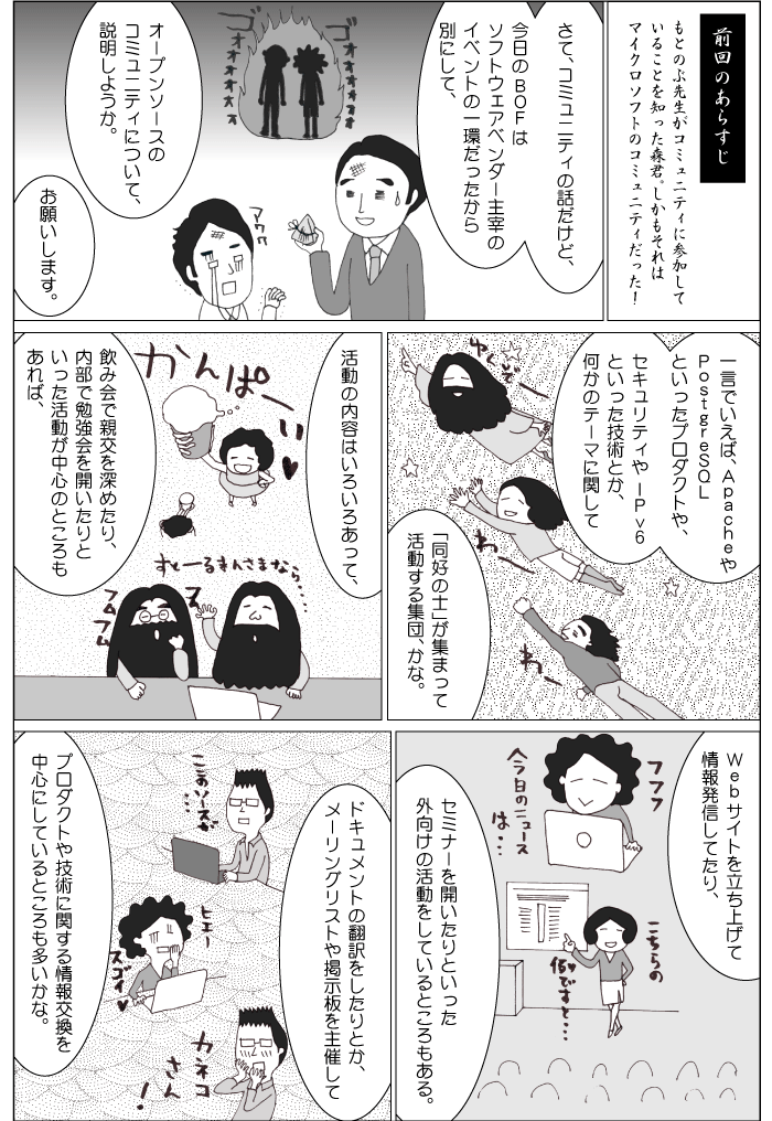 TOPサーバ構築・運用> マンガ版 たかはしもとのぶの「はじめてのオープンソース」 第13回:オープンソースコミュニティは何をするところ?(中-前編)