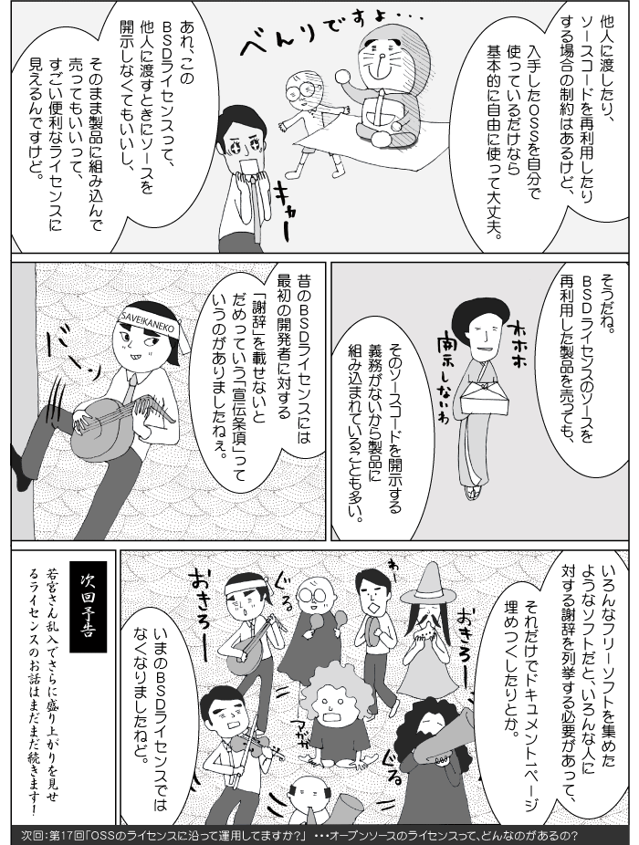 > マンガ版 たかはしもとのぶの「はじめてのオープンソース」 第17回:オープンソースのライセンスに沿って運用してますか?(中-前編)