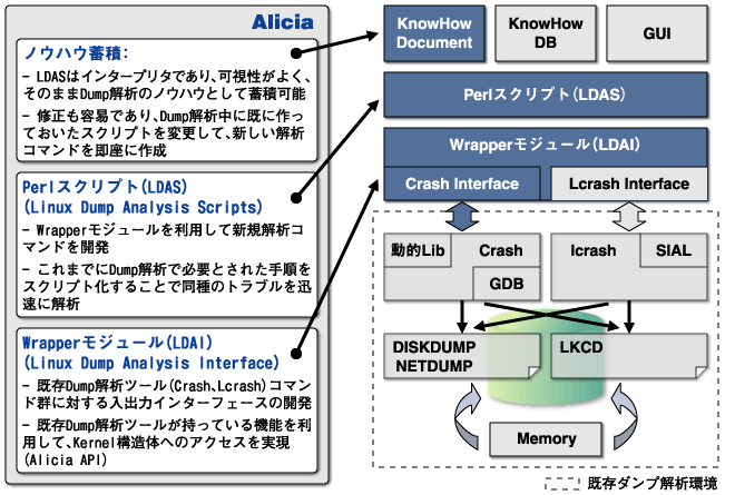 つまり、一からすべてを開発するのではなく、既存のツールのよいところは生かしつつ、軽量言語で既存のツールをラッピングし、ツール間で共通のインターフェースを利用できる統合型解析ツールとすることで、開発要件を実現しようとしたものである。Aliciaを作成することにより、ダンプ解析の環境は以下のようになる。