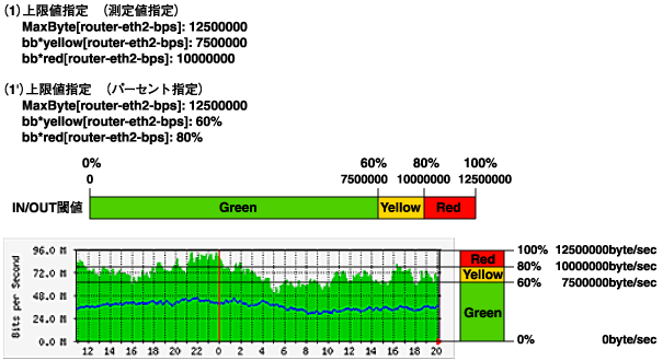 <測定項目>のトラフィック監視の注意・警報レベルのしきい値を設定します。bb*yellowが注意レベル、bb*redが警報レベルの指定になります。値の設定方法は測定値とパーセント値の2つが設定でき、パーセント指定の場合には<測定項目>で設定される「MaxBytes[<測定項目>]:」での値を100%とした比率で計算されます。