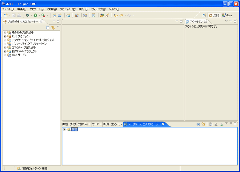 まずは、Eclipse WTPとデータベースを接続して各種操作ができるようにします。Eclipseのメニューから「ウィンドウ → ビューの表示 → その他」を選択します。次に表示された「ビューの表示」ウィンドウから「データ → データベース・エクスプローラー」を選択し、「OK」ボタンをクリックすると、図1のような「データベース・エクスプローラー」ビューが表示されます。このビューは主にDBとの接続の管理などを行います。