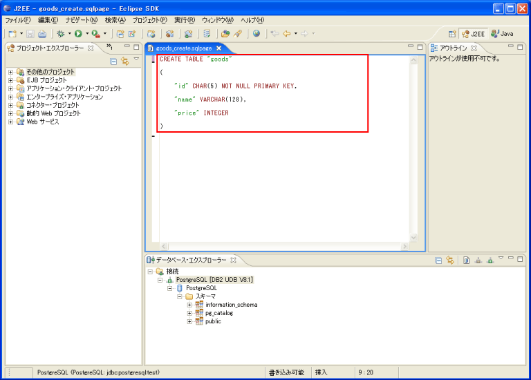 表示されたエディタで図5の四角で囲まれた部分のように編集してください。これは、サンプルで使用するテーブルの定義となります。