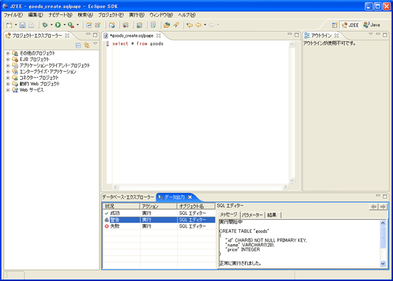 編集をしたらエディタ内で右クリックし、「SQLの実行」を選択してください。SQLが実行され、図6のような「データ出力」ビューが出現します。「データ出力」ビューはSQLの実行結果を表示します。これでサンプル用のテーブルが定義されました。