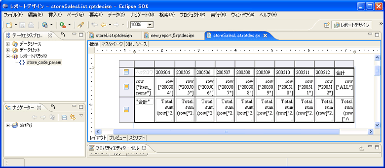 組み込んだ「店舗一覧表」を選択し、プロパティエディタのバインドタブから、デフォルト値を変更します。式ビルダーで「使用可能なデータセット」にメインレポートで使用しているデータセット「StoreListDataSet」から店舗コードである「row["STORE_CODE"]」を選択します。