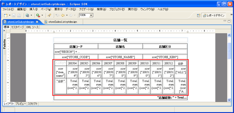 店舗一覧には後ほどサブレポートを組み込むために、サブレポート用の行を新たに追加しておきます。