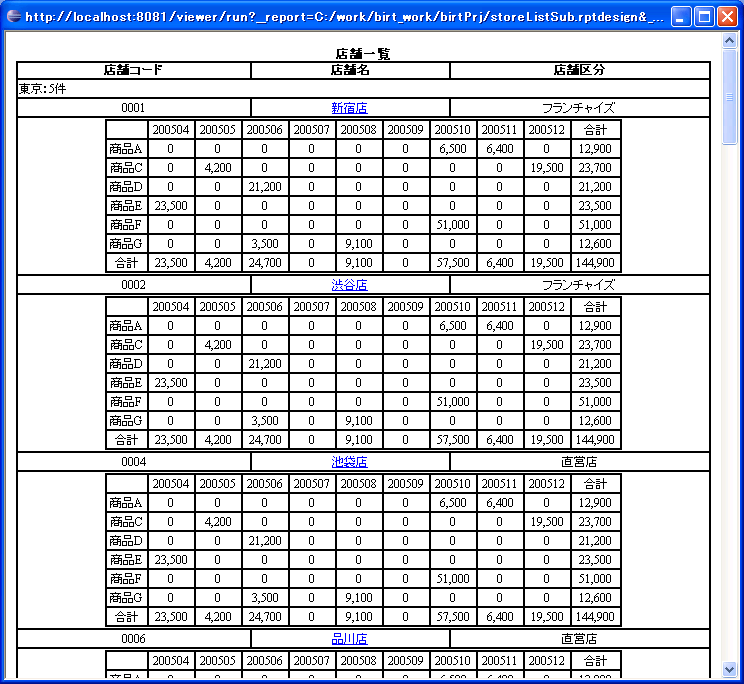 プレビューでサブレポートが店舗ごとに出力されていることを確認してみましょう。