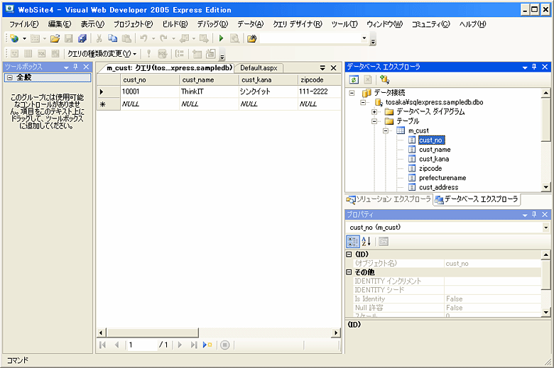 SQL Server Management Studioでデータベースを確認しながら開発することもできるが、Visual Web Developer 2005からもSQL Serverを操作することができる。それには、画面右側の「ソリューションエクスプローラ」の表示を「データベースエクスプローラ」に変更し、データ接続を右クリックして「接続の追加」を選択する。