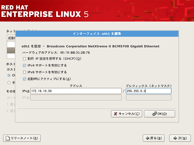NICインターフェースに固定IPアドレスを付加するには「編集」をクリックします。IPアドレスとネットマスクを入力します。IPv6を利用しない場合は「IPv6サポートを有効にする」のチェックをはずします。OS起動時にNICインターフェースの利用を有効にするには「起動時にアクティブにする」にチェックを入れておきます。