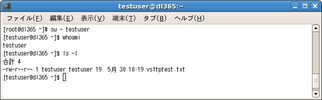 FTPサーバ上で「su - testuser」コマンドを実行してtestuserアカウントに移行し、「/home/testuser」ディレクトリのファイルをlsコマンドで確認します。図3のようにアップロードされたvsftptest.txtファイルが存在していればFTPサーバは稼動しています。