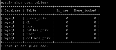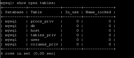 MySQLサーバを起動してすぐの状態では、6つのテーブルが開かれていることがわかります。では、実際のところどのようなテーブルが開かれているのでしょうか。こちらはMySQLコマンドラインから確認できます。