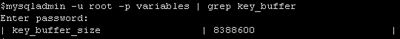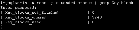 MySQLでは、キーをブロックという単位で扱います。1ブロックのサイズ(key_cache_block_size)はデフォルトで1024bytesです。現在のキーバッファの使用量は、以下のようにして確認できます。