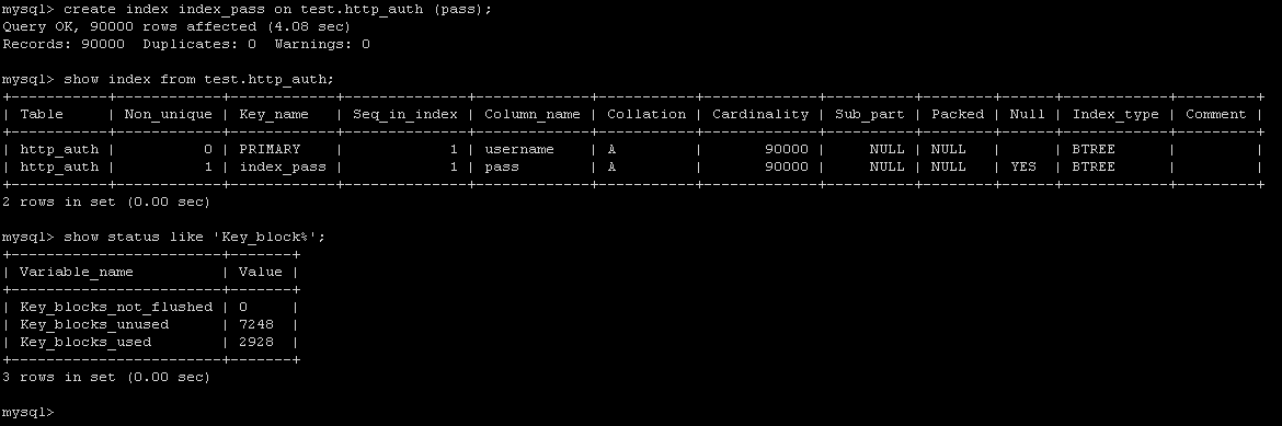 「Column_name」がpassとなっているものが作成したインデックスで、正常に作成されたことがわかります。しかしそれ以外にusernameというインデックスもあります。これは、http_authテーブル作成時にusernameを主キーに指定したため、暗黙的に生成されたインデックスです。また最後にKey_block_usedを確認すると、2928ブロックが一時的に使用されたということがわかります。