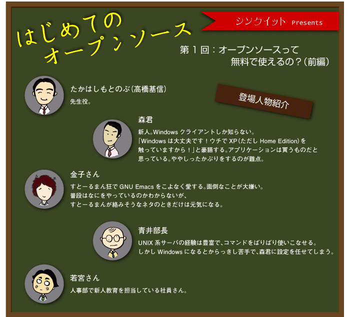 > マンガ版 たかはしもとのぶの「はじめてのオープンソース」 第1回:オープンソースって無料で使えるの?(前編)