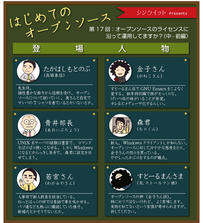 TOPサーバ構築・運用> マンガ版 たかはしもとのぶの「はじめてのオープンソース」 第17回:オープンソースのライセンスに沿って運用してますか?(中-前編)
