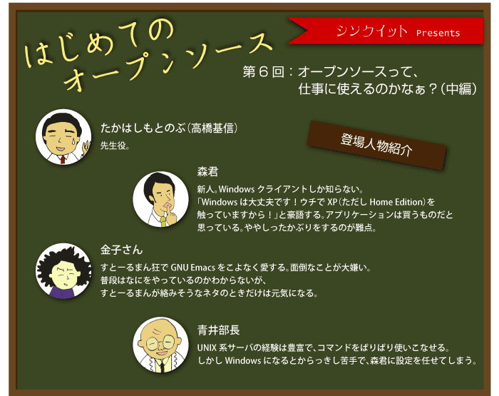 > マンガ版 たかはしもとのぶの「はじめてのオープンソース」 第6回:オープンソースって、仕事に使えるのかなぁ?(中編)