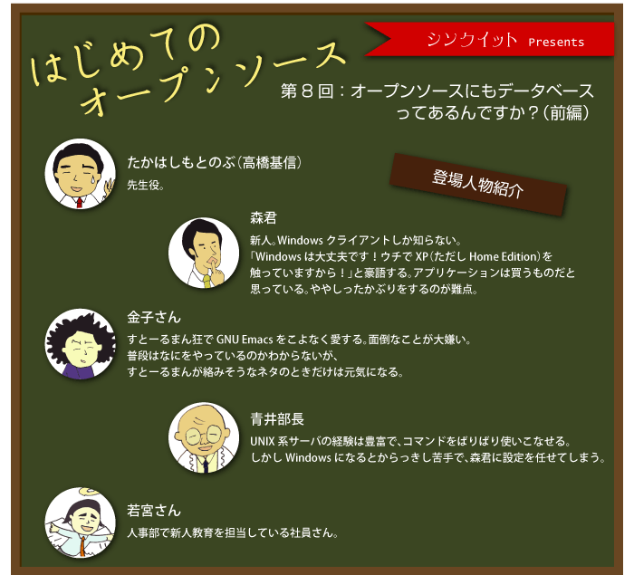 > マンガ版 たかはしもとのぶの「はじめてのオープンソース」 第8回:オープンソースにもデータベースってあるんですか?(前編)