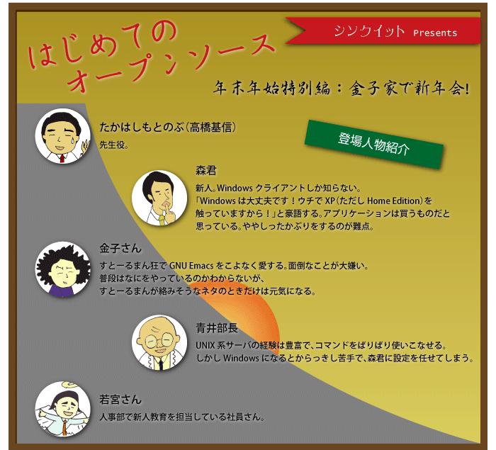 > マンガ版 たかはしもとのぶの「はじめてのオープンソース」 年末年始特別編:金子家で新年会