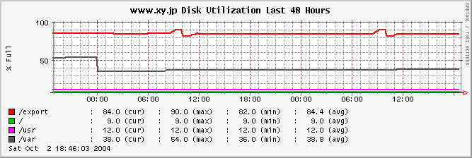 短期レンジ(図1)ではほぼデイリーバッチによる変化で大きな変化はみえませんが、長期レンジ(図2)での経過をみてみると/exportパーティションが緩やかな上昇傾向をたどっていることがわかります。グラフの傾きからおおよそのディスク増設の時期を予測することで、事前に障害を防ぐことが可能となります。
