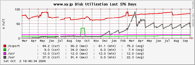 図2:Webサーバのディスク使用状況経過(長期レンジ:576日周期) (画像をクリックすると別ウィンドウに拡大図を表示します)