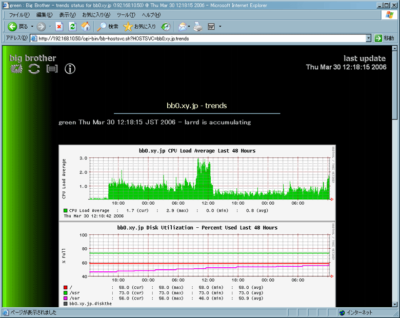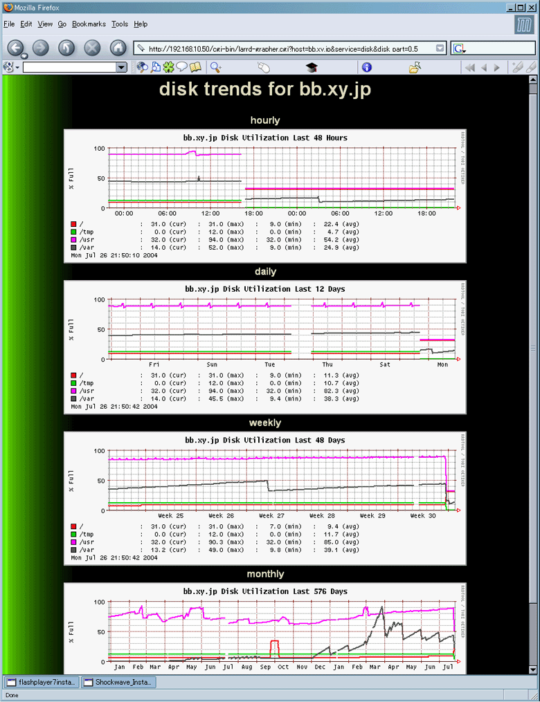図1:Webサーバのディスク使用状況経過(短期レンジ:48時間周期) (画像をクリックすると別ウィンドウに拡大図を表示します)