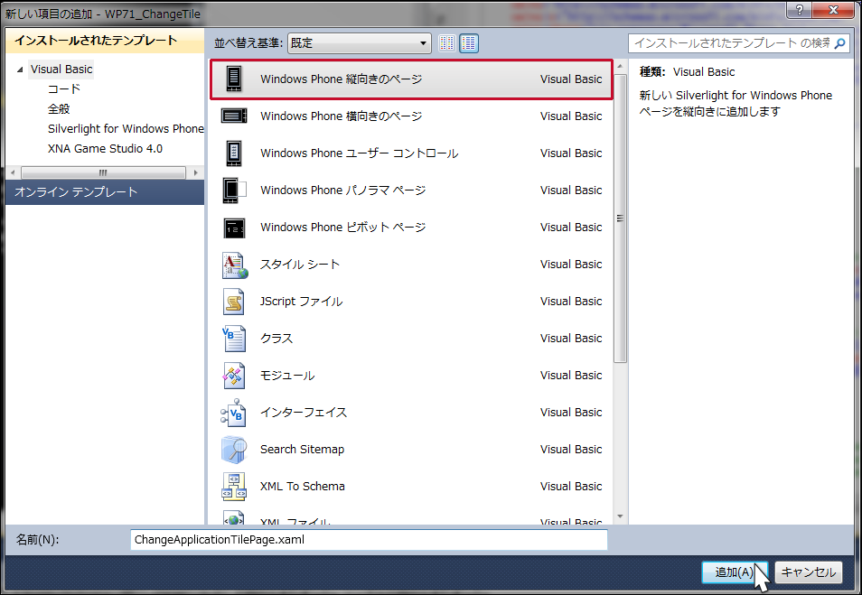 VS2010メニューの「プロジェクト(P)/新しい項目の追加(W)」と選択して、「Windows Phone 縦向きページ」を追加します。「名前(N)」には、ChangeApplicationTilePage.xamlと指定します(図5)。