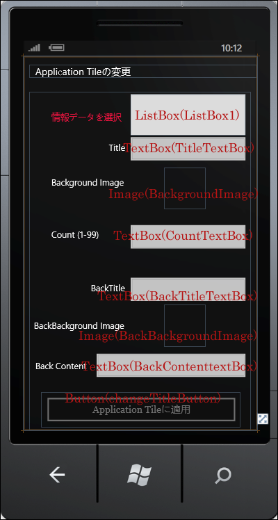 表示されるエミュレーターのデザイン画面上に、ツールボックスから、ListBox、TextBlock、TextBox、Image、Buttonコントロールを図6のように配置します。各コントロールに付けているNameにも注意してください。「項目名」の箇所は全てTextBlockコントロールです。Textプロパティに項目名を指定します。また、PageTitleという名前のTerxtBlockは削除しています。ApplicationTitleという名前のTextBlockのTextプロパティに、「Application Tileの変更」と指定しています。